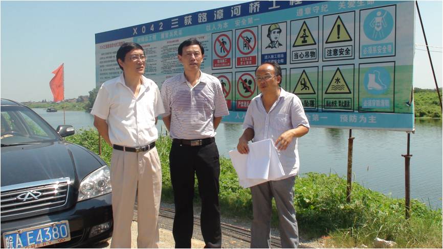 28日上午,中心颜主任与徐主席(左一)、 陶主任(右一)对漳河一带的水利工程进行实地调研。对当地依靠漳河而进行的渔业、种植业及养殖业进行了实地考察。