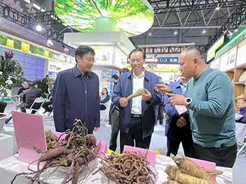 参展药企负责人为颜主任(左二)和戴局长(左一)介绍亳药