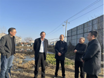 颜主任(右二)一行到孟集镇调研参观特色产业发展基地,陪同调研的有孟集镇党委方书记(左一),陪同调研的还有刘院长(左三)、窦主任(右一)