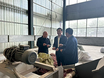 颜主任(右二)在亳州市谯城区芦庙镇辣椒初加工车间调研,陪同调研的有李主任(左一)、辣椒基地刘总(右二)